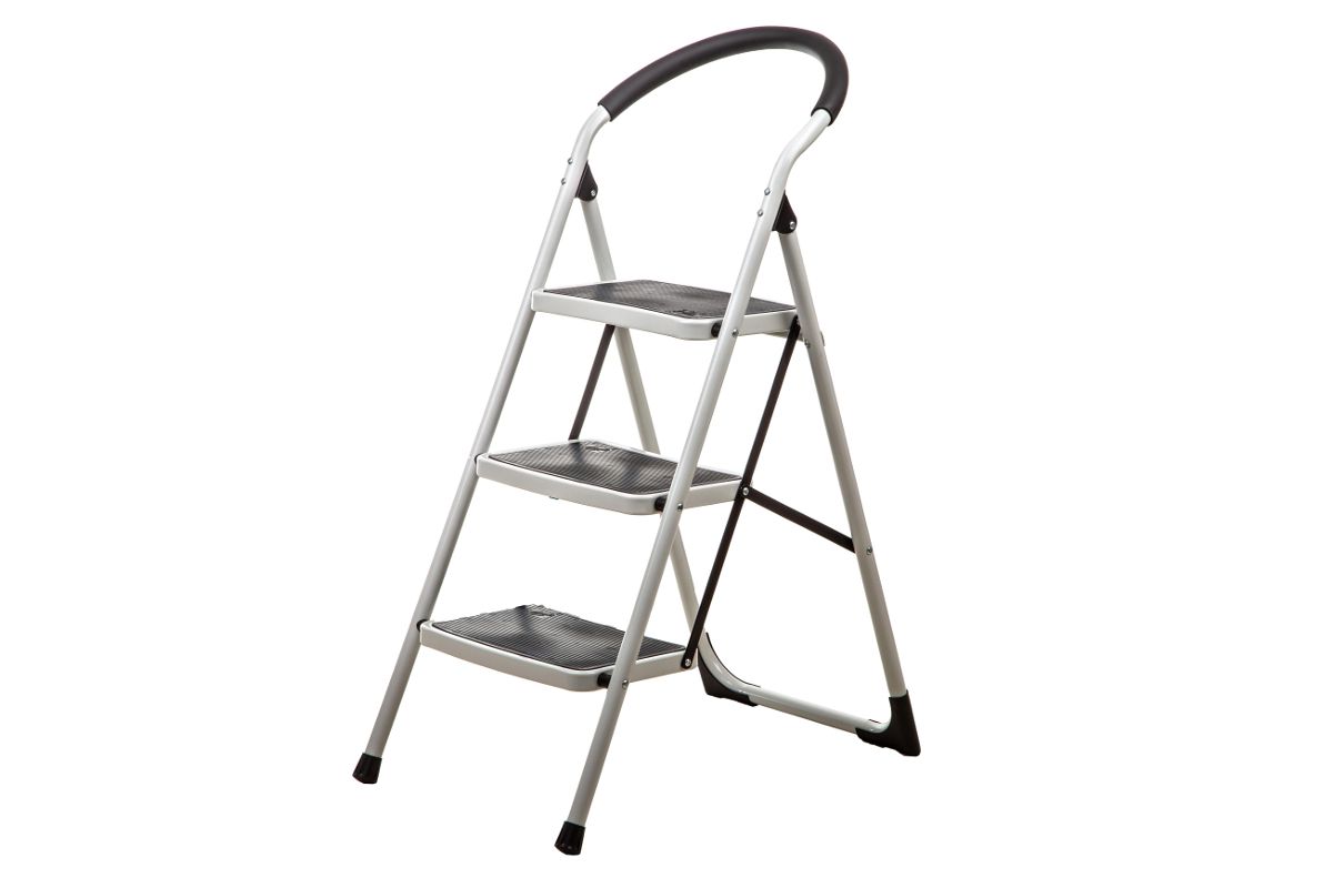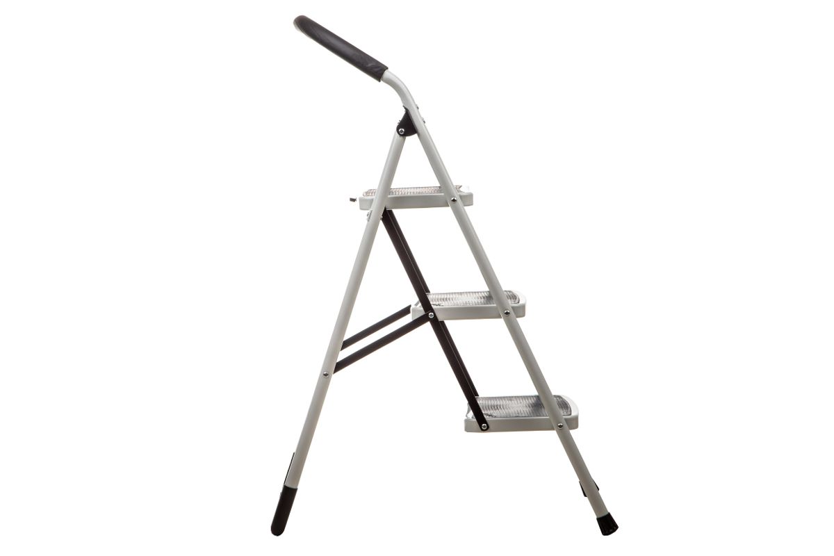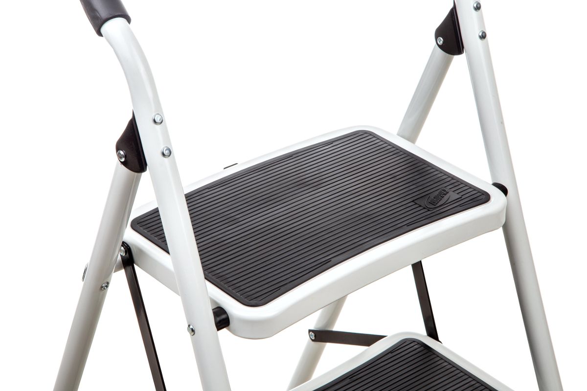 Стремянка снащена удобной ручкой, резиновыми насадками на ножках, комфортной широкой ступенью. Ребристое покрытие ступени, обеспечивает 100% контакт с поверхностью.