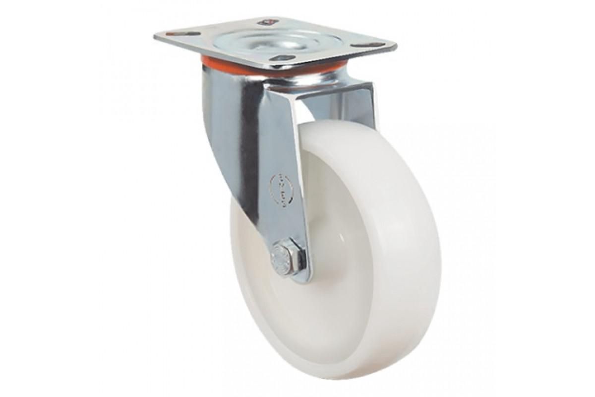 Колесо с поворотным кронштейном с контактным слоем и ободом выполнено из нейлона (полиамида. Этот материал устойчив к истиранию, не оставляет следов на полу, на налипают различные частицы с пола. Колеса из нейлона гигиеничны и устойчивы ко многим агрессивным химическим веществам, за исключением минеральных кислот, хлорированных и солевых растворов. Высокая механическая прочность достигнута путем нанесения цинкового слоя на сталь кронштейна. Цинк улучшает стойкость листа к механическим нагрузкам и абразивному износу. В оси колеса установлен подшипник скольжения. Не боится ударных нагрузок и не требует ухода. В поворотном узле установлен двухрядный шариковый подшипник, отвечающий за маневренность в движении. Для продолжительной эксплуатации, в узле установлено защитной кольцо, которые препятствуют проникновению внутрь подшипника различных загрязнителей.