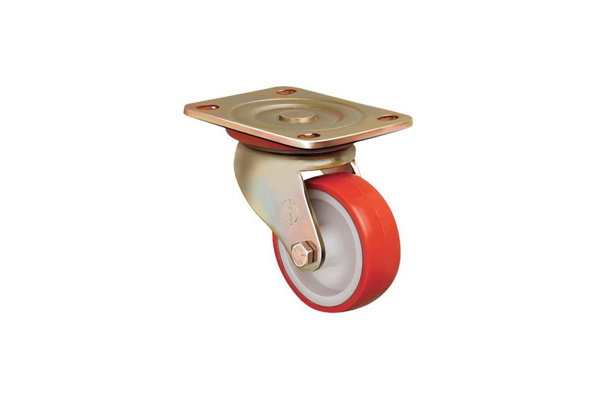 Колесо с поворотным кронштейном с контактным слоем (протектор из отлитого под давлением красного термопластичного полиуретана с отличным сопротивлением качению и высоким уровнем устойчивости к износу. Высокая механическая прочность достигнута путем нанесения цинкового слоя желтого цвета на сталь кронштейна. Цинк улучшает стойкость листа к механическим нагрузкам и абразивному износу. Высокая прочность достигнута за счет полностью монолитного корпуса из высококачественного нейлона (полиамида. В оси колеса установлен шариковый подшипник качения. Для бесперебойной работы внутри подшипника установлен сепаратор для удержания сферических тел на положенном месте. Обеспечивает легкость и плавность движения. В поворотном узле установлен двухрядный шариковый подшипник, отвечающий за маневренность в движении. Для продолжительной эксплуатации, в узле установлено защитной кольцо, которые препятствуют проникновению внутрь подшипника различных загрязнителей.